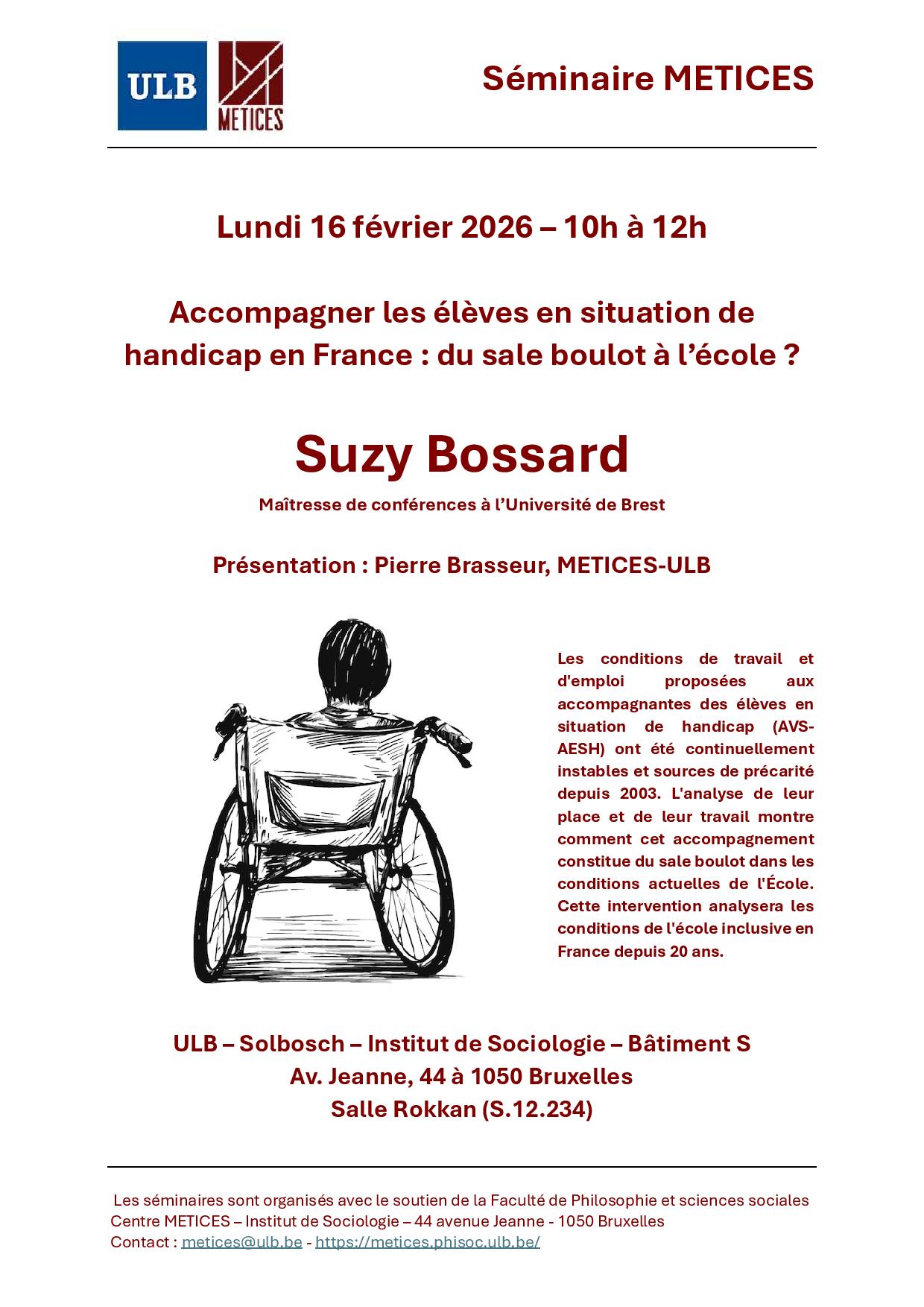 Les conditions de travail et d'emploi proposées aux accompagnantes des élèves en situation de handicap (AVS-AESH) ont été continuellement instables et sources de précarité depuis 2003. L'analyse de leur place et de leur travail montre comment cet accompagnement constitue du sale boulot dans les conditions actuelles de l'école. Cette intervention analysera les conditions de l'école inclusive en France depuis 20 ans.