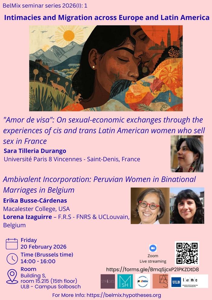 This will be a dual-presentation session featuring Sara Tilleria Durango, who will give a talk entitled “‘Amor de visa’: On sexual-economic exchanges through the experiences of cis and trans Latin American women who sell sex in France”, and Erika Busse-Cárdenas and Lorena Izaguirre, who will present their research entitled “Ambivalent Incorporation: Peruvian Women in Binational Marriages in Belgium.”