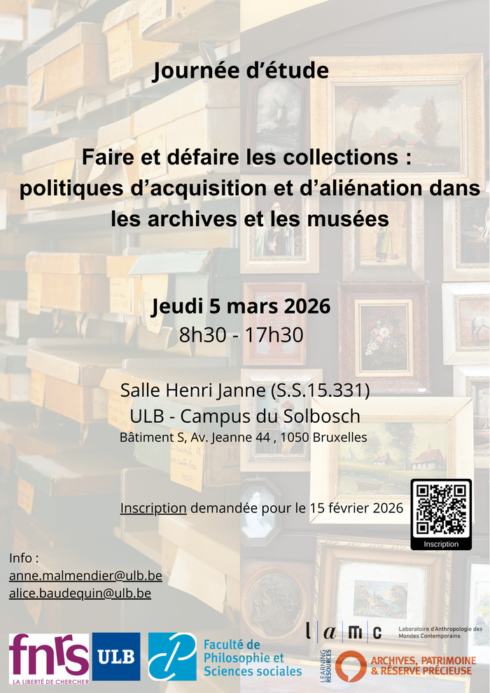 Nous avons le plaisir de vous convier à la Journée d'étude "Archives et Musées" qui aura lieu le jeudi 5 mars 2026 (8h30 - 17h30) à l’ULB (Campus Solbosch).