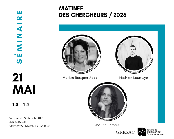 Nous vous proposons de découvrir les travaux menés au GRESAC : des membres de l’équipe présenteront l’avancement de leurs recherches. Nous aurons le plaisir d’assister aux présentations d'Hadrien Loumaye (ULB-GRESAC), de Marion Bocquet-Appel (ULB-GRESAC) et de Noéline Somme (SBSEM, CEBRIG).