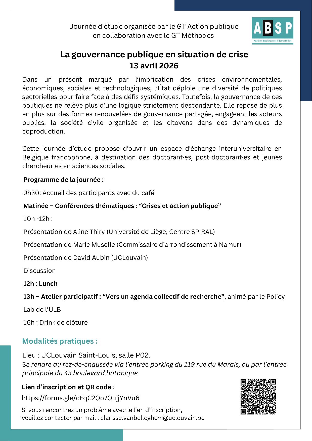 Organisée par le Groupe de Travail "Action Publique" et le Groupe de Travail “Méthodes" de l’ABSP, elle articulera des conférences thématiques le matin et un atelier participatif l’après-midi, consacré aux approches, terrains et méthodologies mobilisés pour analyser l’action publique en contexte de crise.