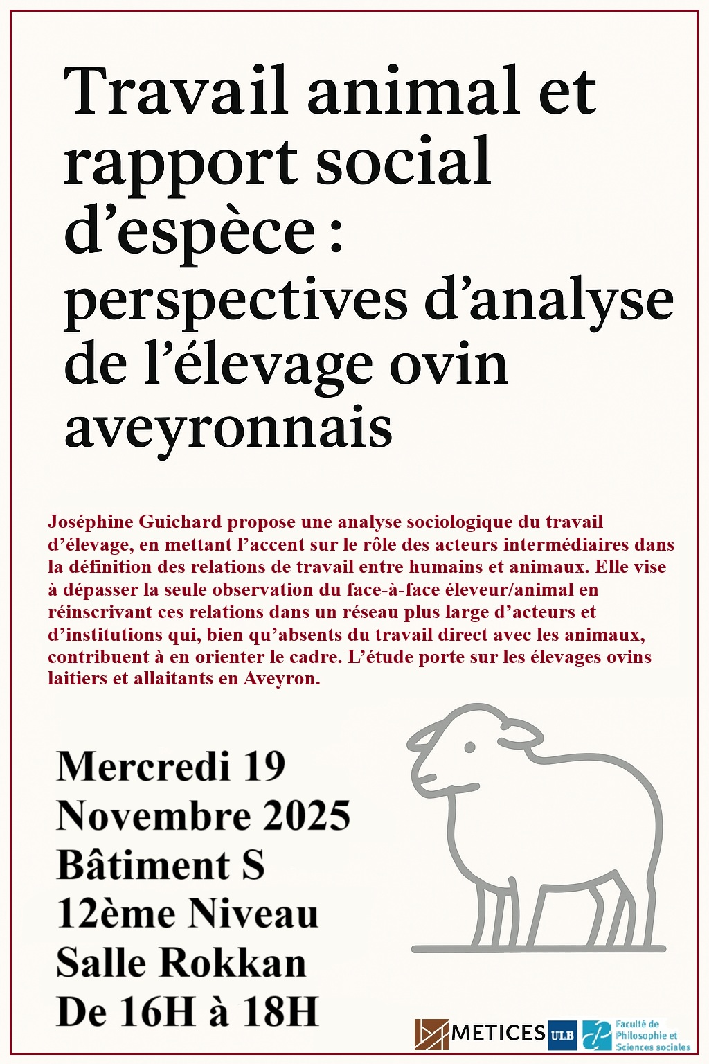 Le lundi 19 novembre prochain, le séminaire du CENTRE METICES (Migrations, Espaces, Travail, Institutions, Citoyenneté, Epistémologie, Santé) accueil Joséphine Guichard (CRESPA, Université Paris 8) pour une présentation autour du : « Travail animal et rapport social d’espèce : perspectives d’analyse de l’élevage ovin aveyronnais », à partir de 16h00 à la salle Rokkan, Bâtiment S, 12ème étage.